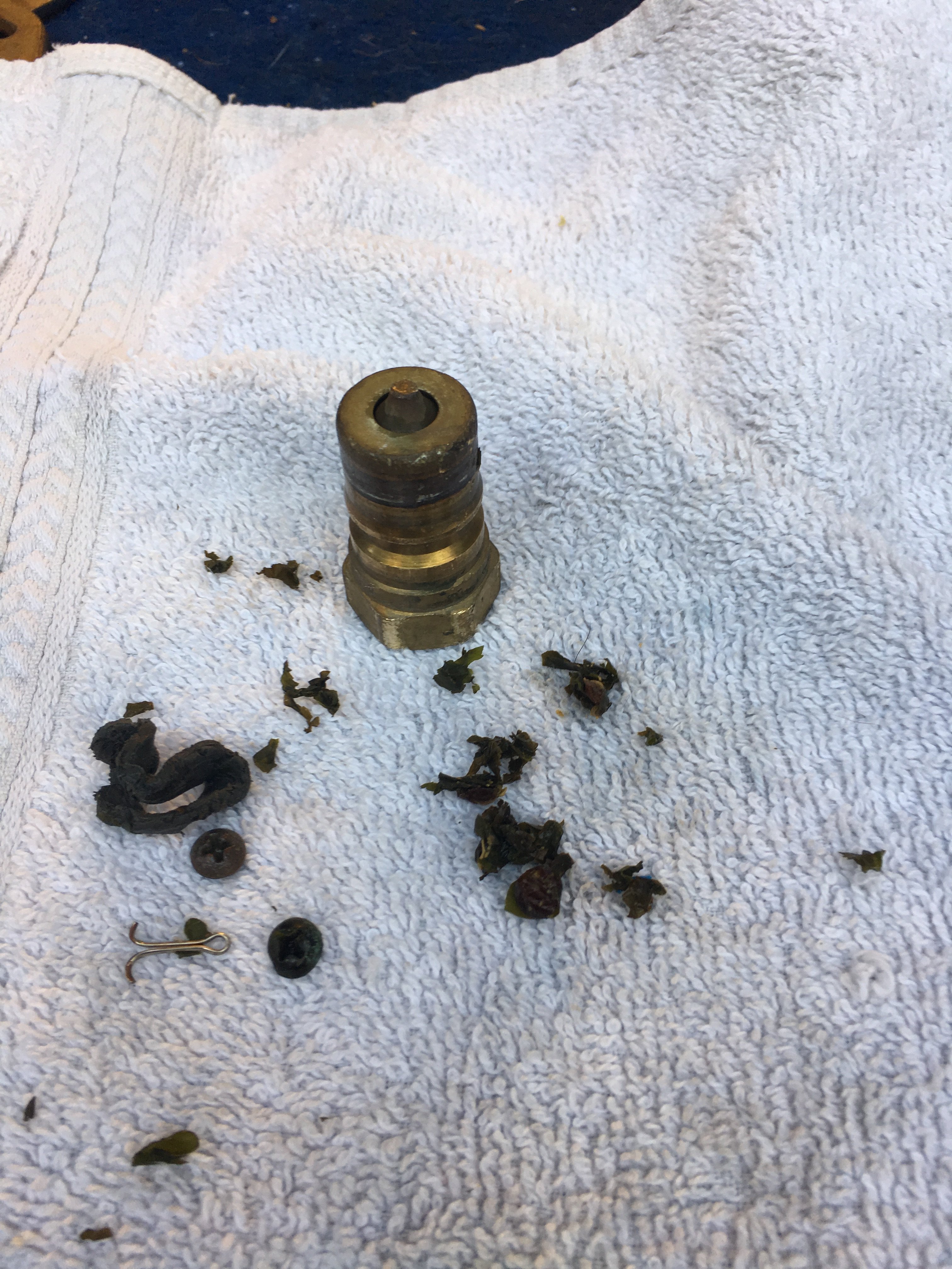 I returned to my shop and started looking into the issue. The water pressure at my shop is excellent. I hooked the water up and nothing was getting to the water box. After some more probing, I decided to take apart one of my QD’s on my fresh water supply hose. What I discovered was amazing. That thing was clogged with all sorts of exciting things. I pulled out two screw heads, a corter pin, rubber hose gasket, bug guts, and a bunch of leaves. The QD was packed so tight with debris not a single molecule could pass. After a good cleaning, all was back to normal.