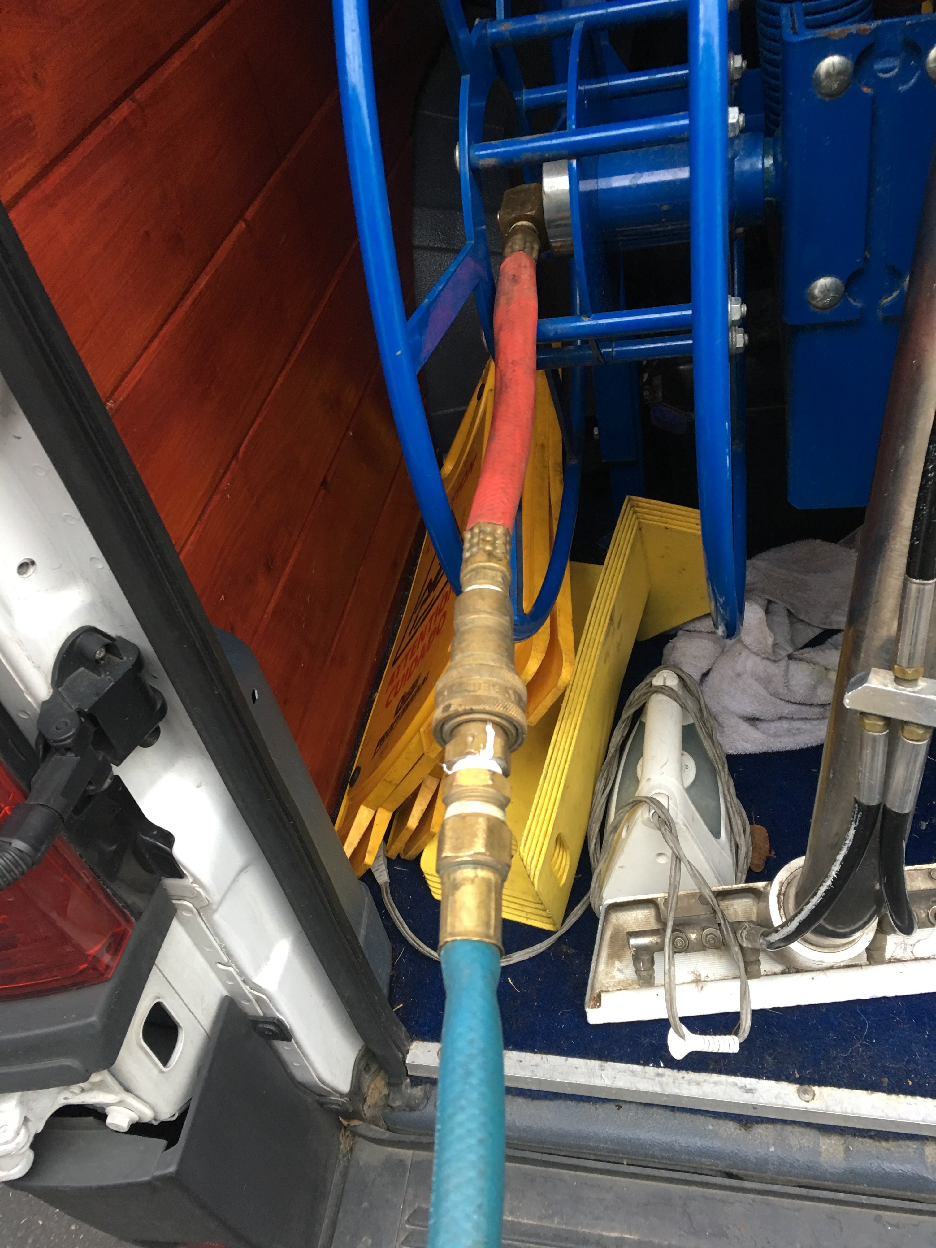 Replace that oversized blue hose with a high quality 1/4” air hose and double the length of hose for jobs that might not have easy water access and makes it less stress on a sink faucet
