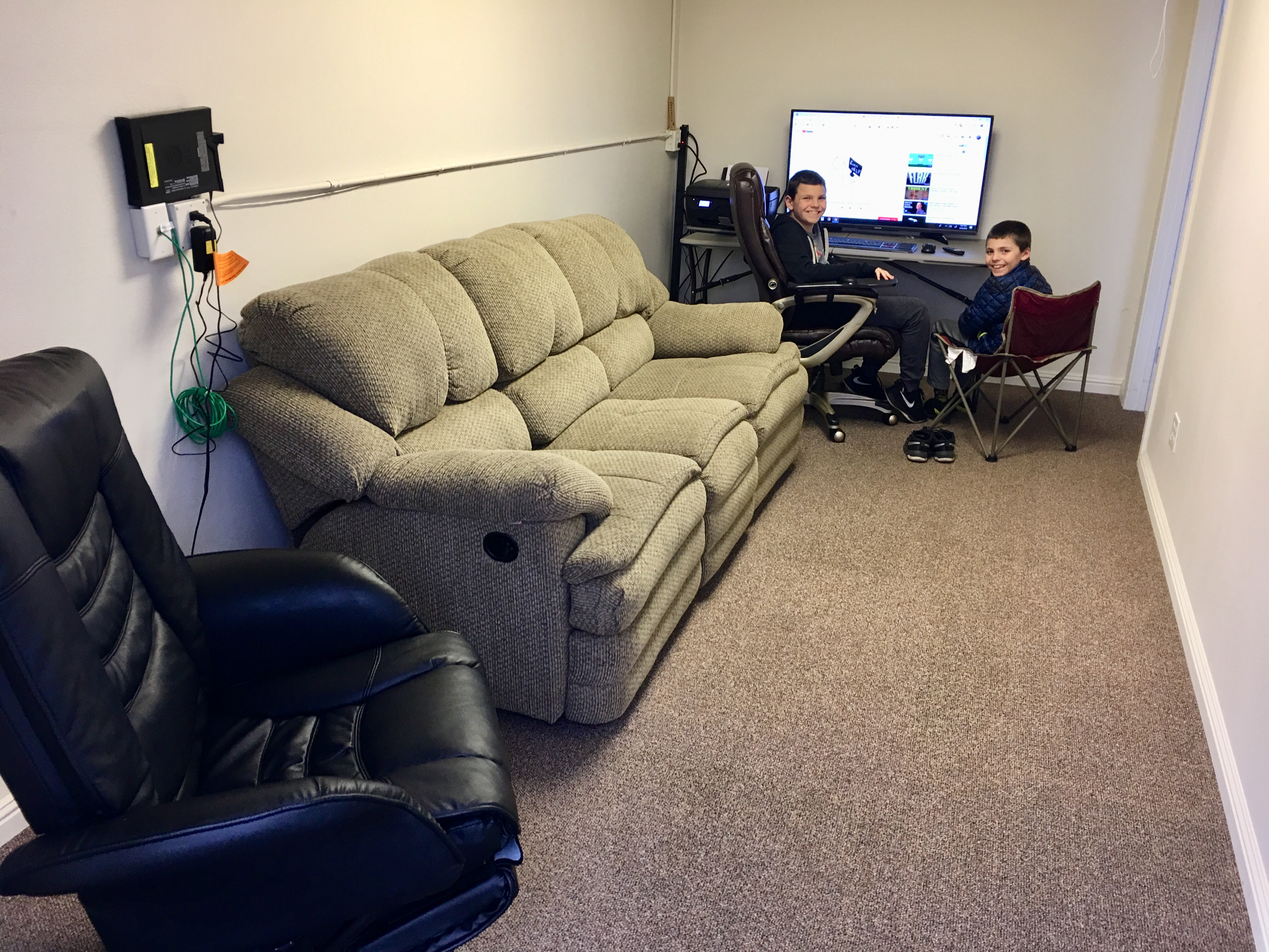 Gotta beer fridge yet?Whew I got it in. Had to take it apart. The office is coming together. I’ve got a 55” tv coming for the wall that’ll be mounted in front of the couch, making a black walnut live edge table for under the tv for my printer to sit on, and am making a Redwood live edge desk. The 43” computer monitor seen in the pic will also be mounted on the wall.
