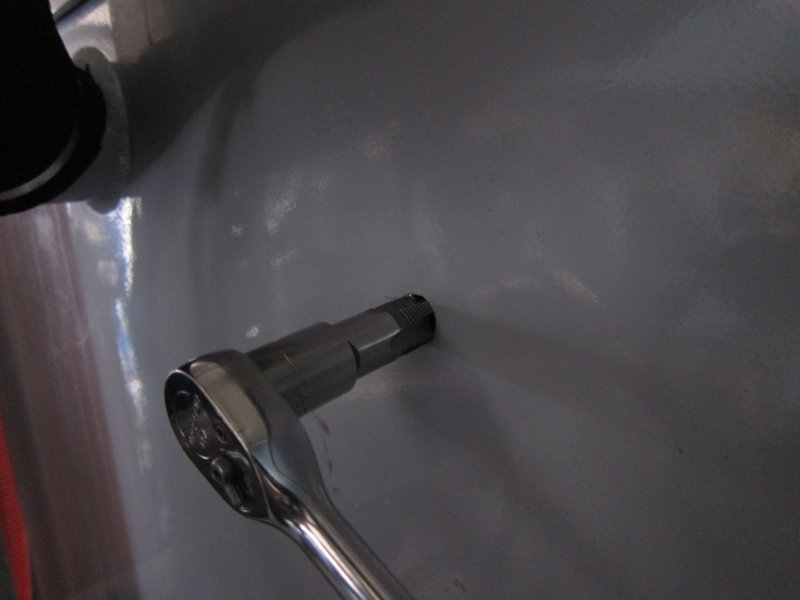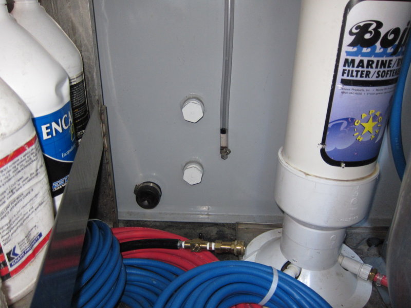 pics of installing a sight tube on waste tank. You need a 9/16" drill, 3/8" pipe tap, tap handle or socket and ratchet, 1/2"barbX3/8"mpt elbow, 1/2"i.d. clear hose (thick) and a float. For a float I sniped off a piece of 3/8" black thermoplastic hose. If you're nervous about cutting threads, practice on piece of scrap the same thickness of your tank. Then no guessing on level of waste.