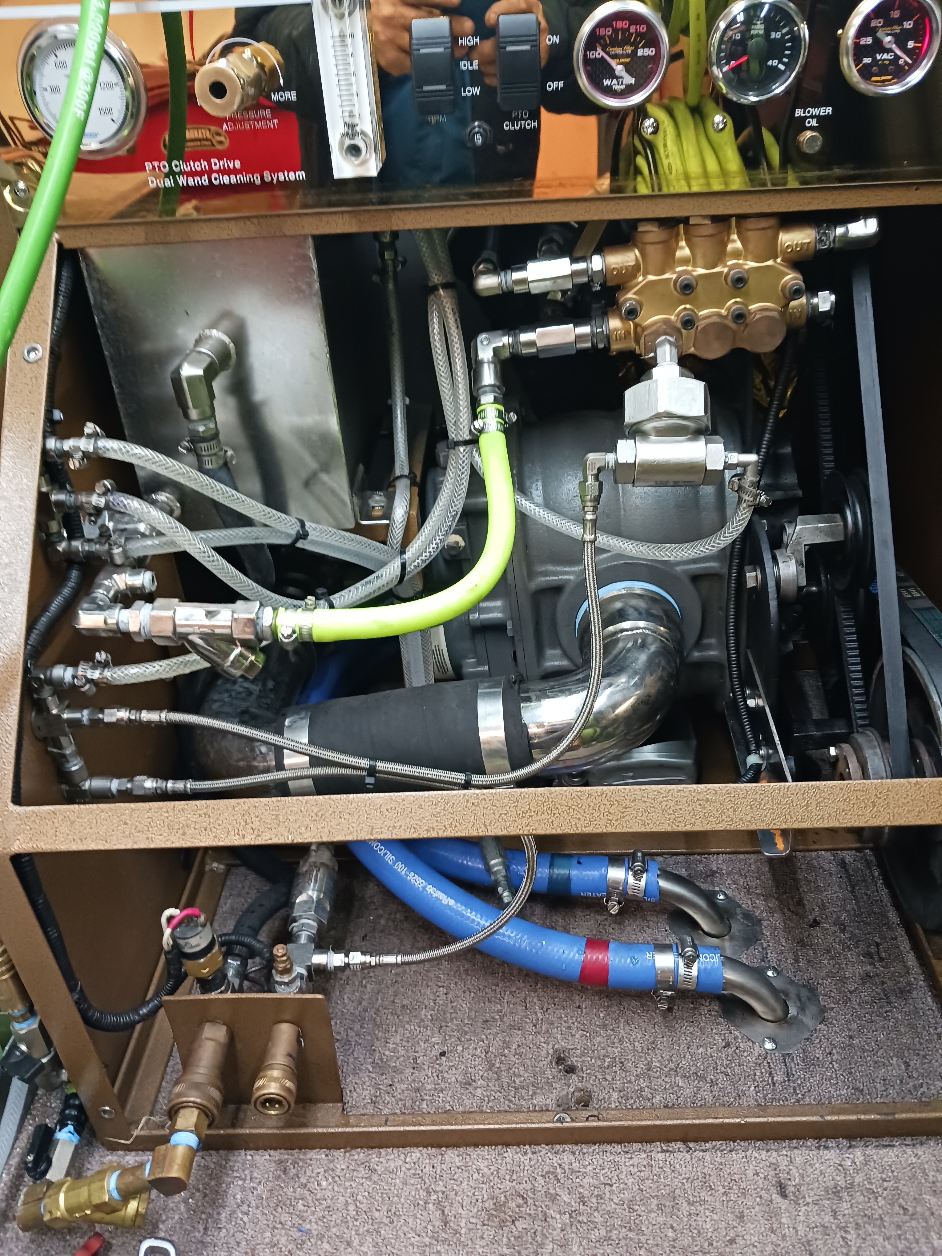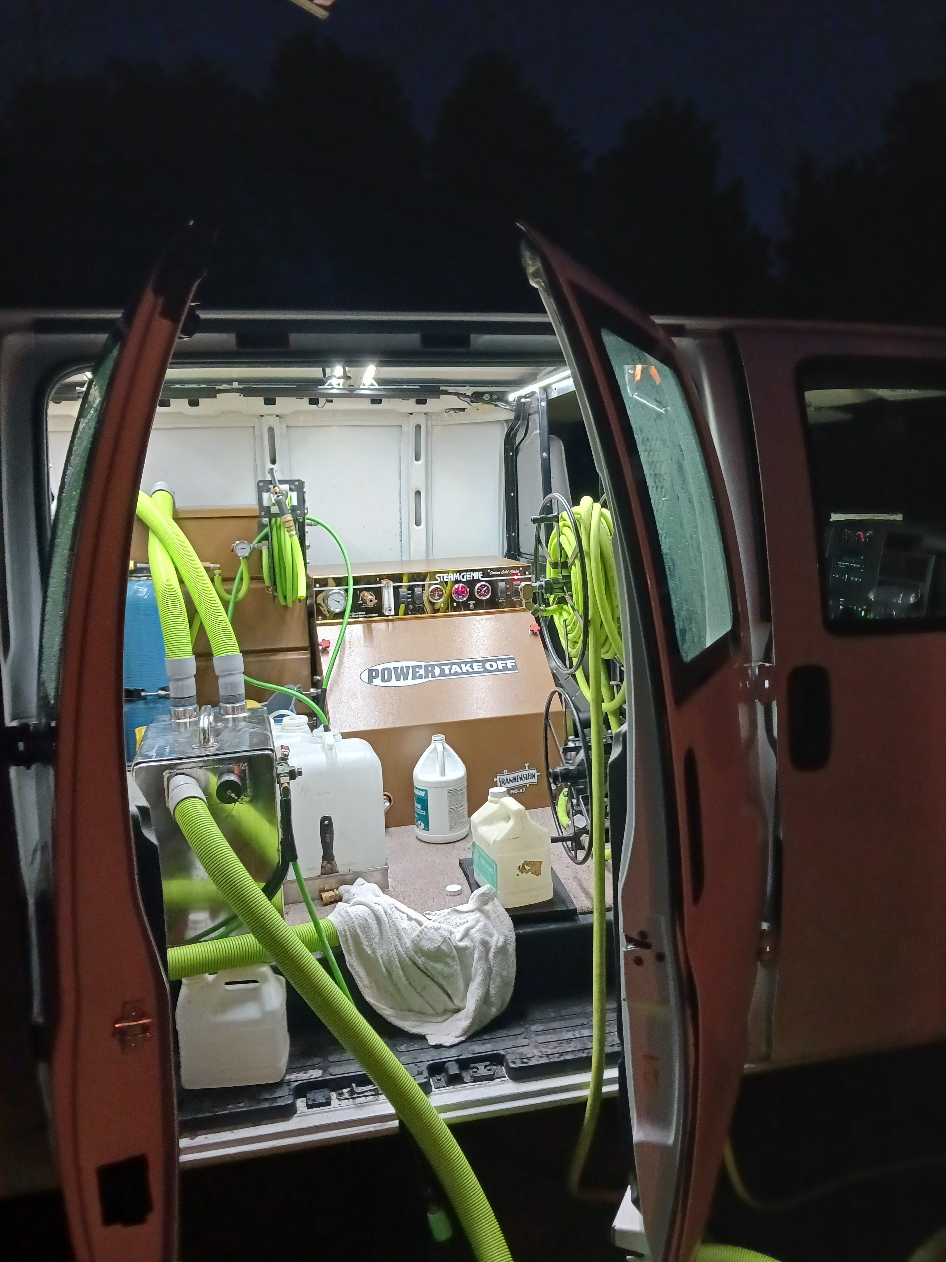 If you're considering pto's over slide in, heat is a consideration, i bought an entire fleet of steamgeni pto's from a company in Sacramento, the 2 problems that most of them had in common was due to #1 lack of maintenance and #2 heat . When the machines are running the vans engine rpm is at the equivalent of approximately 35mph however 35mph winds are not moving threw and underneath the van as designed . In Sacramento where these machines came from it reaches 100-110° during the summer common problems with vans were burnt spark plug wires brittle wiring harnesses, power steering and hydraboost leaks and failures fuel system problems and shorten transmission life span etc etc. I however live on the coast my shop within site of the ocean advantage year round temperature about 59° and highs around 72° in the summer not so much of a problem. When building Frankenstein and designing to eliminate future problems a few modifications were made to the van to address the potential heat issue #1 insulation on spark plug wires#2 removal of power steering under van pipe and replaceing it with factory severe duty cooler and also adding additional aftermarket power steering cooler with filter lastly adding severe duty transmission cooler. Adding these things at the time of pto installation has greatly reduced the under hood heating problems and i highly recommended anyone considering buying or that owns a pto to do these simple modifications it'll save you alot of money and eliminate alot of future downtime. These modifications i do where temps are low and find more and more important the hotter it gets outside you guys with the leaky power steering systems probly already know what im talking about anyway it's a thought ounce of prevention is definitely worth a pound of cure