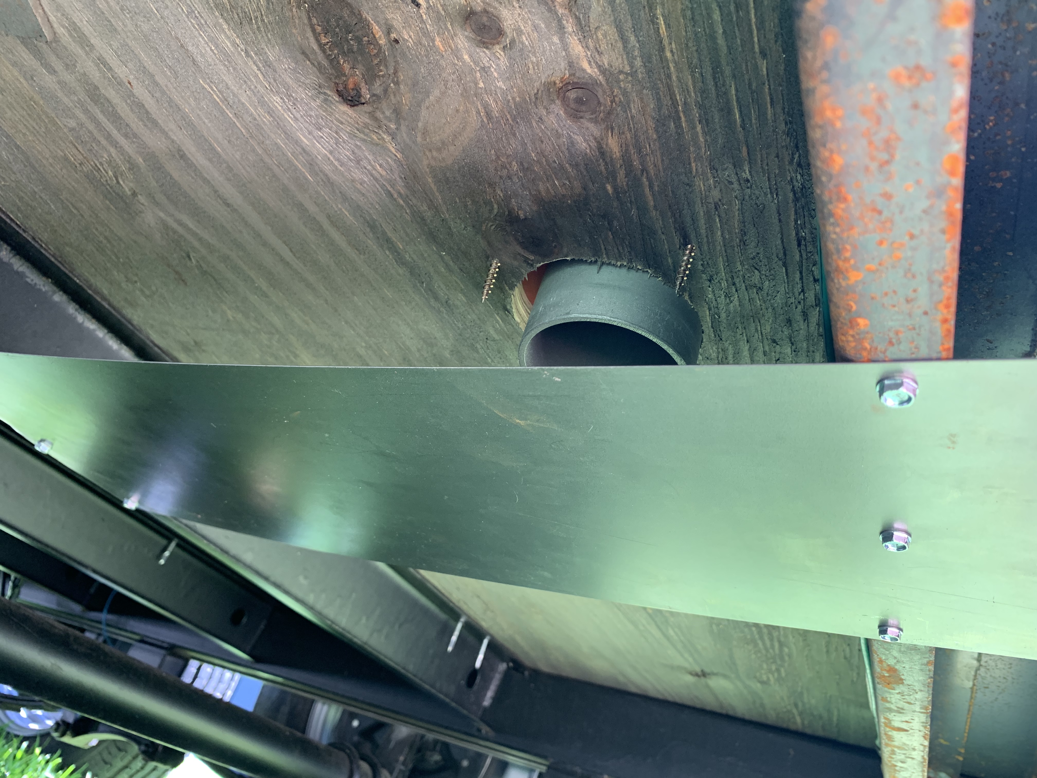 Go to tractor supply and get a plate of metal to screw on the two frame bars underneath the wood. That should give a 2-3" gap from the opening of the exhaust to the plate which will make it spread out in both directions. I did that on my trailer it it worked perfect. That elbow you're talking about will scrape something in the future