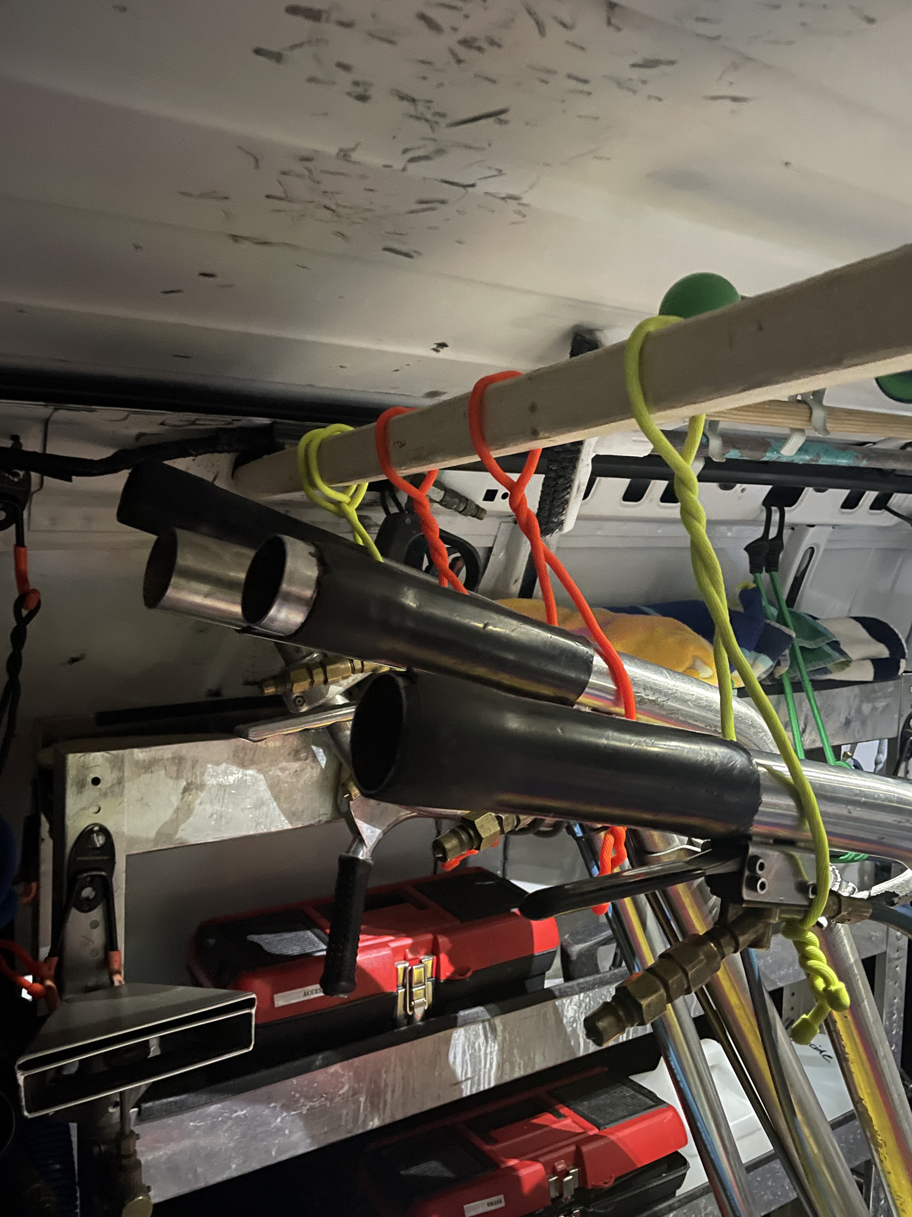 Looking for ideas of how to store wands and tile spinners rakes brushes etc on the roof of Frankenstein (my van) please share pictures if you're using the ceiling of your van for storage